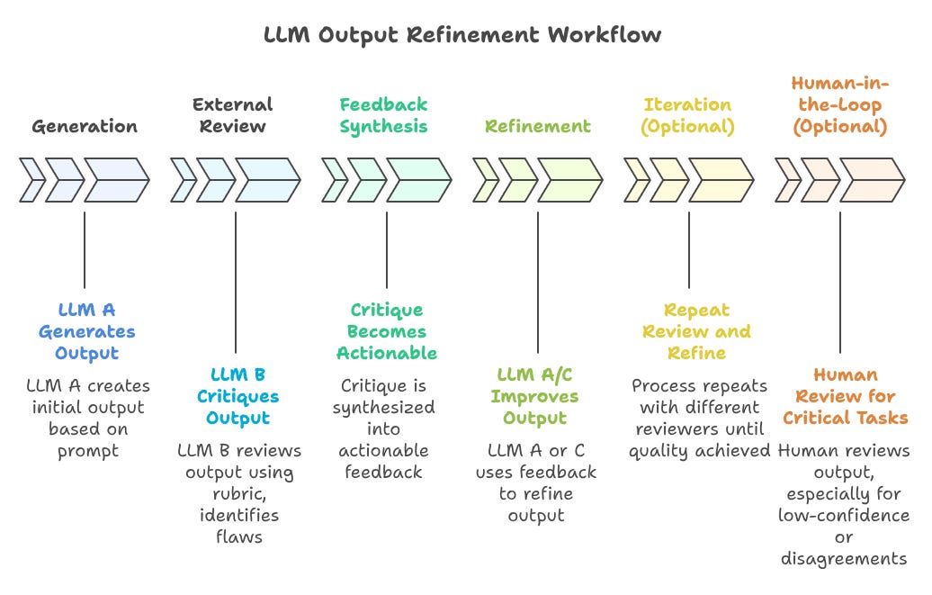 External Review: A different, specialized LLM (the reviewer) critiques the output.